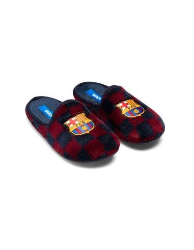 Zapatillas para casa con estampado a cuadros y el escudo del club como protagonista en la pala. Hechas en españa y lavables en lavadora.