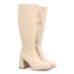 Botas para mujer. Diseño de tejido suave tipo ante, con una caña ceñida que estiliza la pierna y un tacón grueso con plataforma que aporta altura y estabilidad.