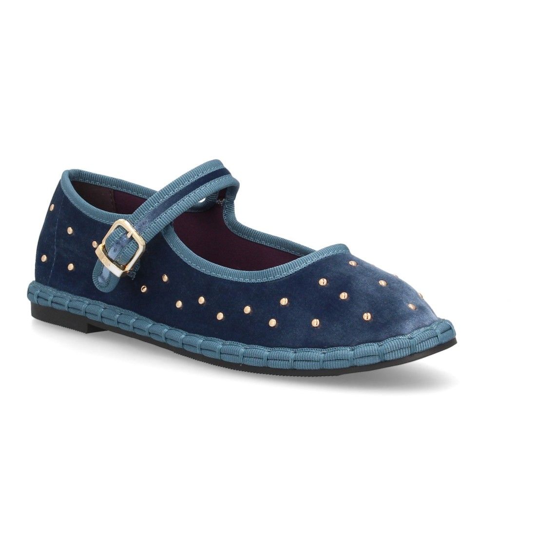 Bailarinas planas para mujer, diseño de apliques metálicos en toda la superfie, hecha de terciopelo con ribete en contraste, suela flexible y cierre de hebilla. Ideal entretiempo.