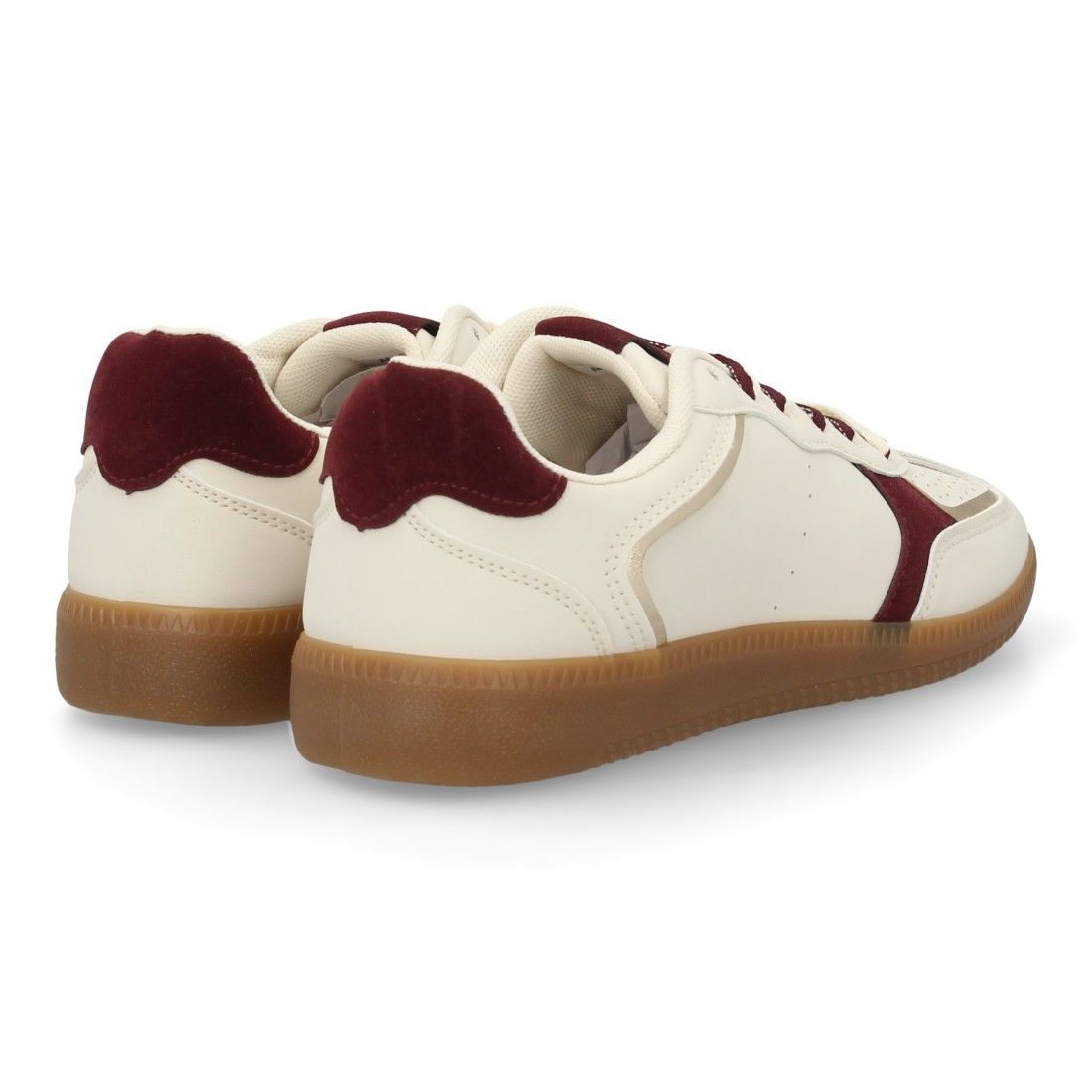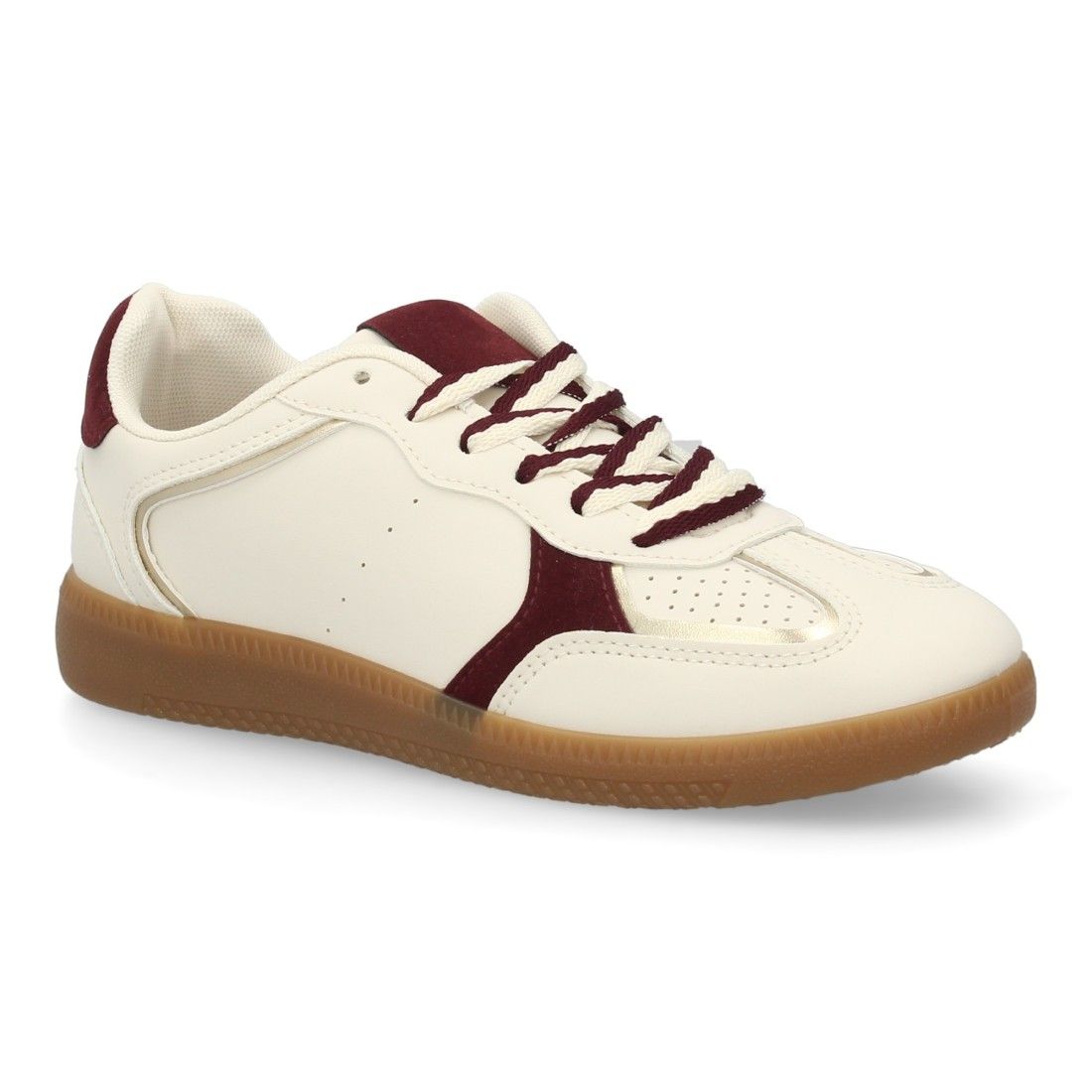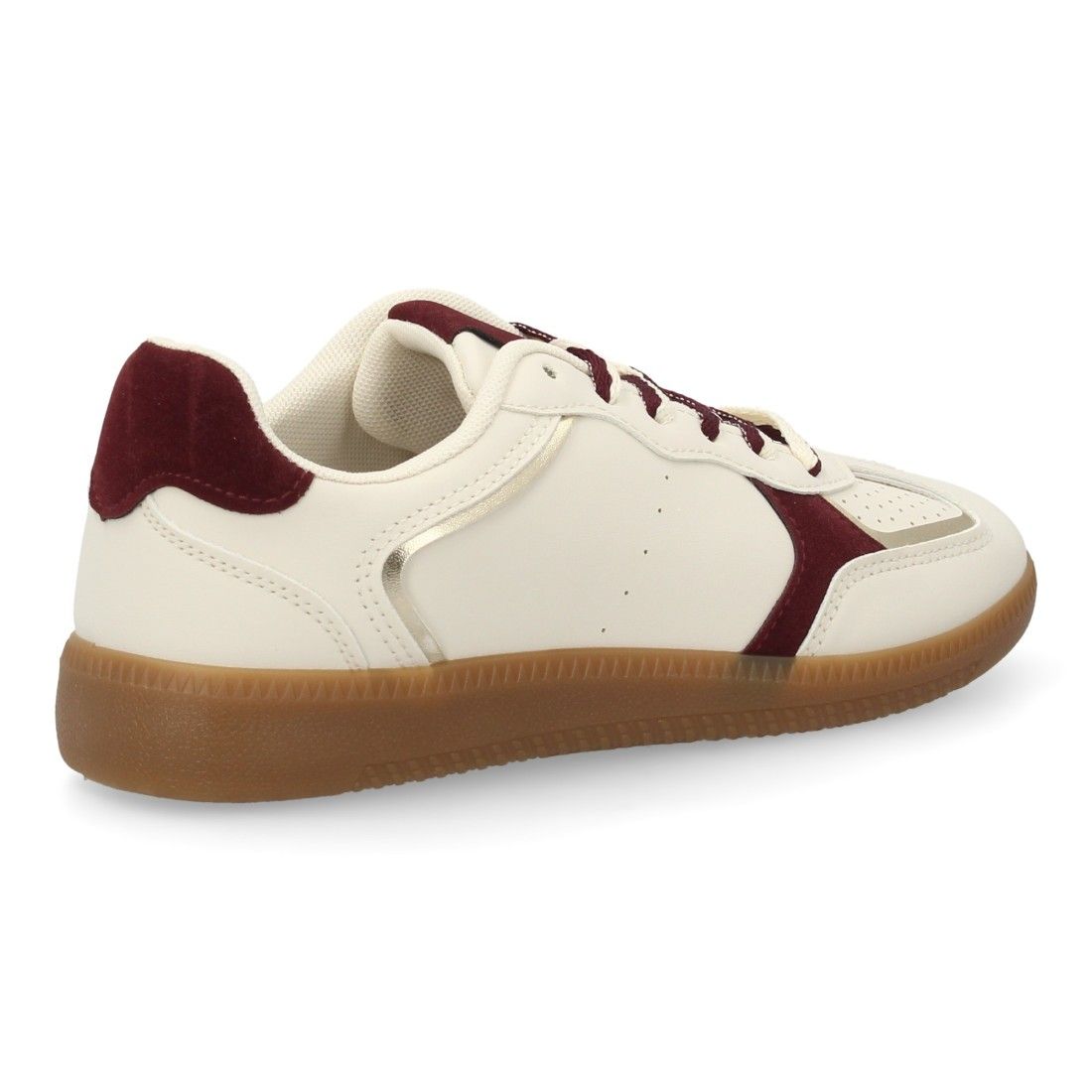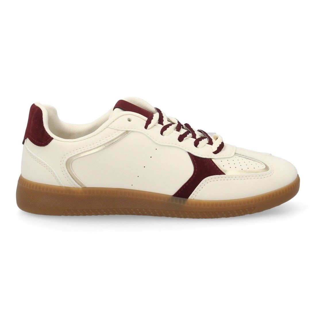 Deportiva para mujer estilo retro con cierre de cordones en dos colores. Materiales suabes y cómodos, refuerzos en tonos metálicos. Suela plana ideal para el día a día.