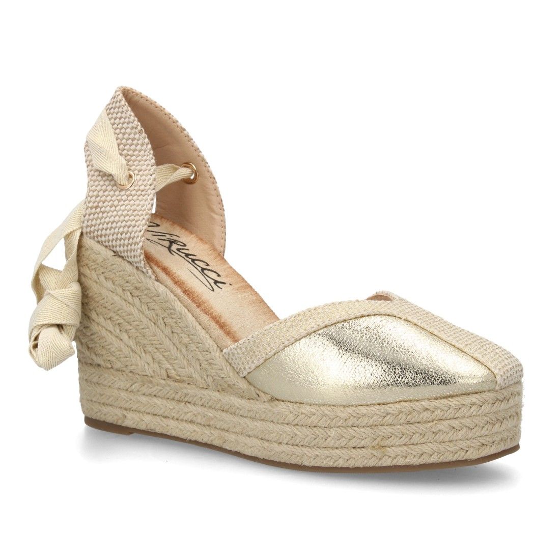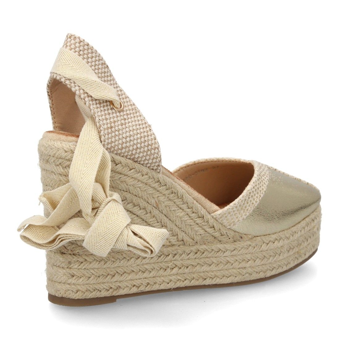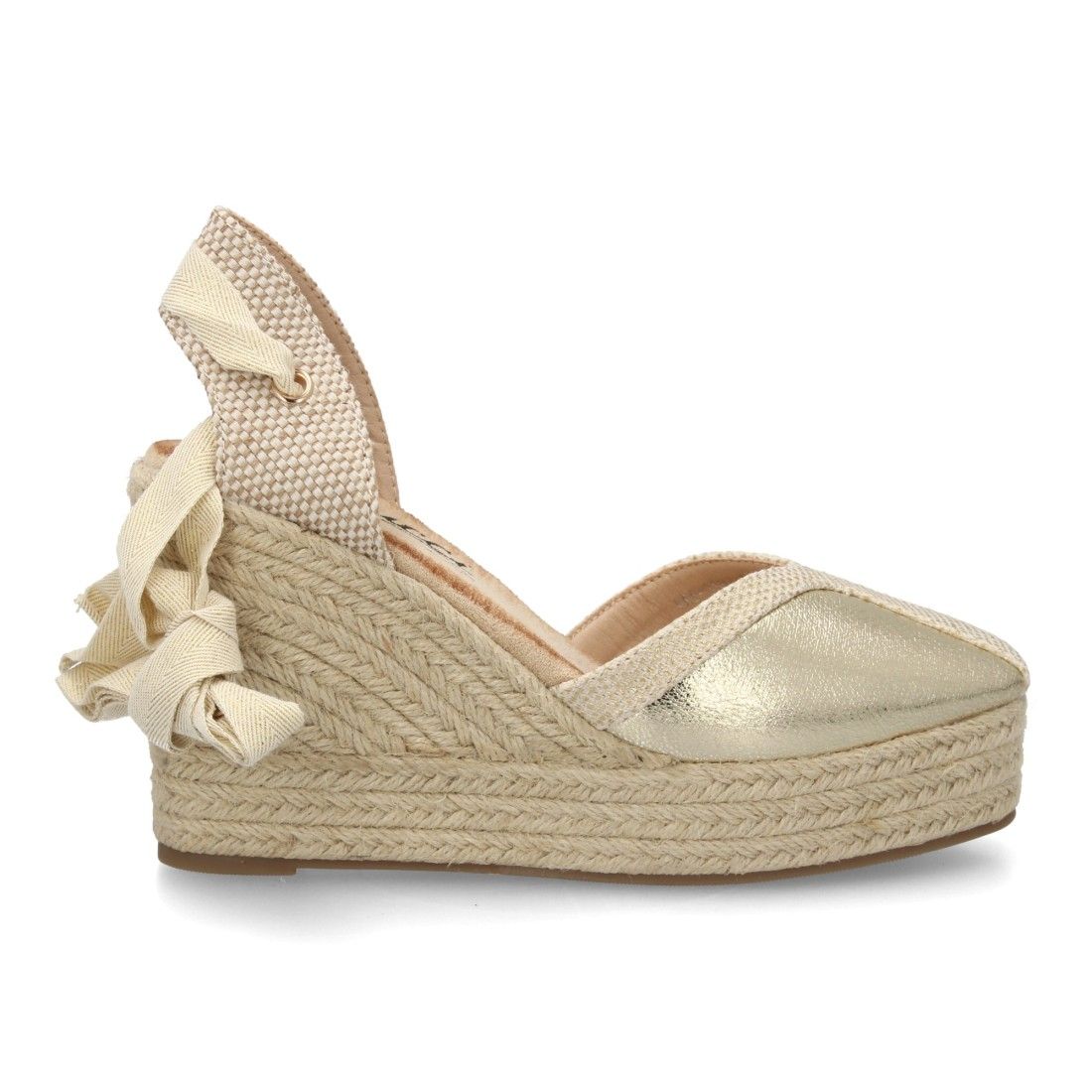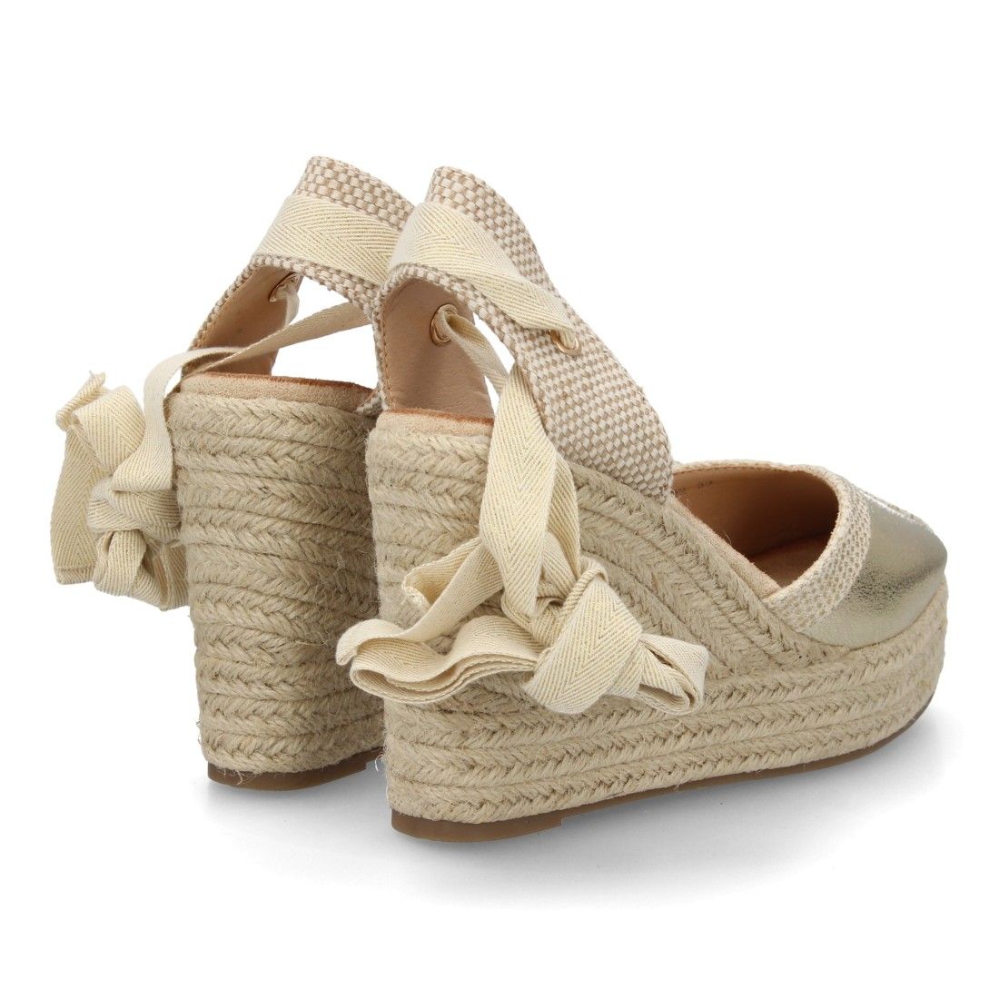 Alpargata sandalia de mujer con cuña alta de esparto para mujer, detalle de texturas. Cierre de cintas al tobillo atadas a la pierna, talon abierto, ideal primavera verano.