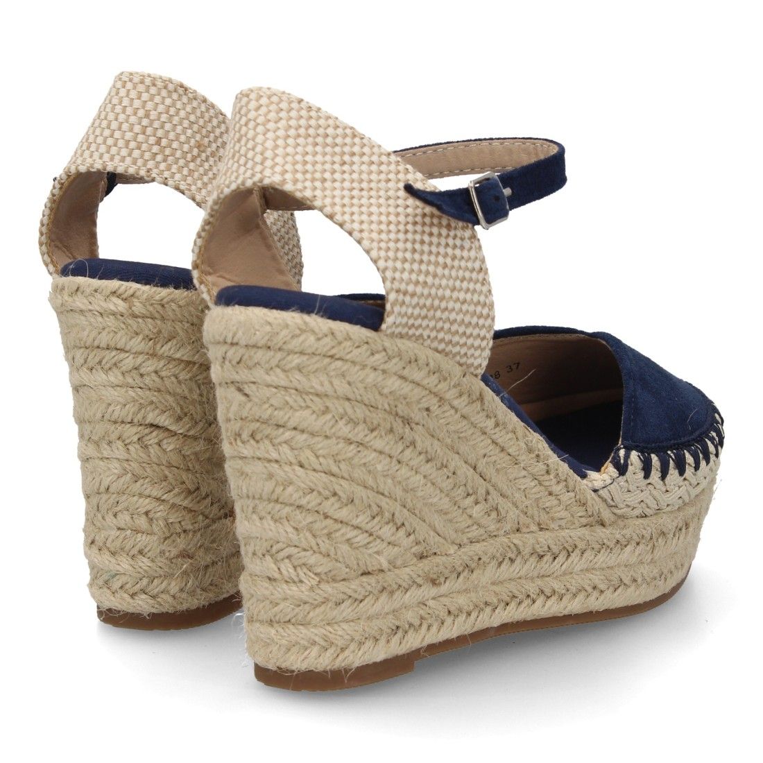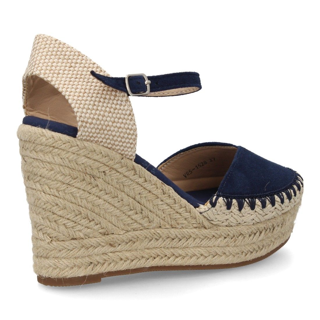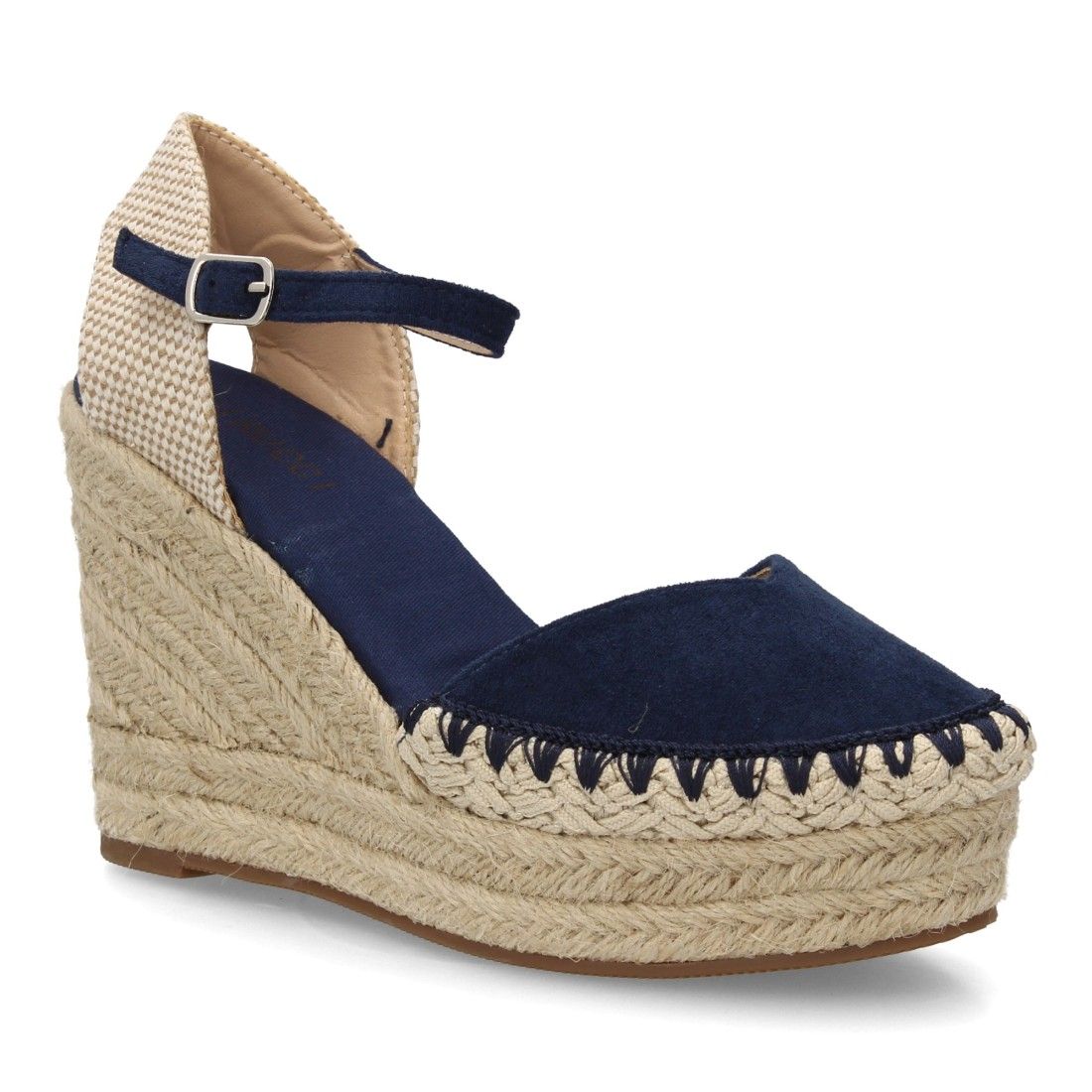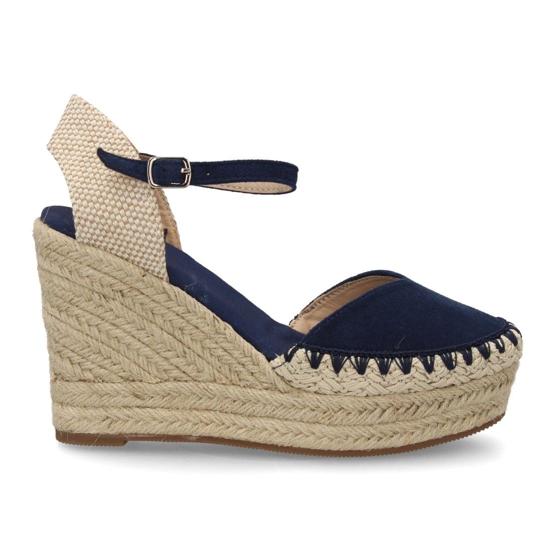 Alpargata sandalia de mujer con cuña de esparto y detalle decorativo en la pala, para mujer, Cierre de hebilla ajustable, talon abierto, ideal primavera verano.