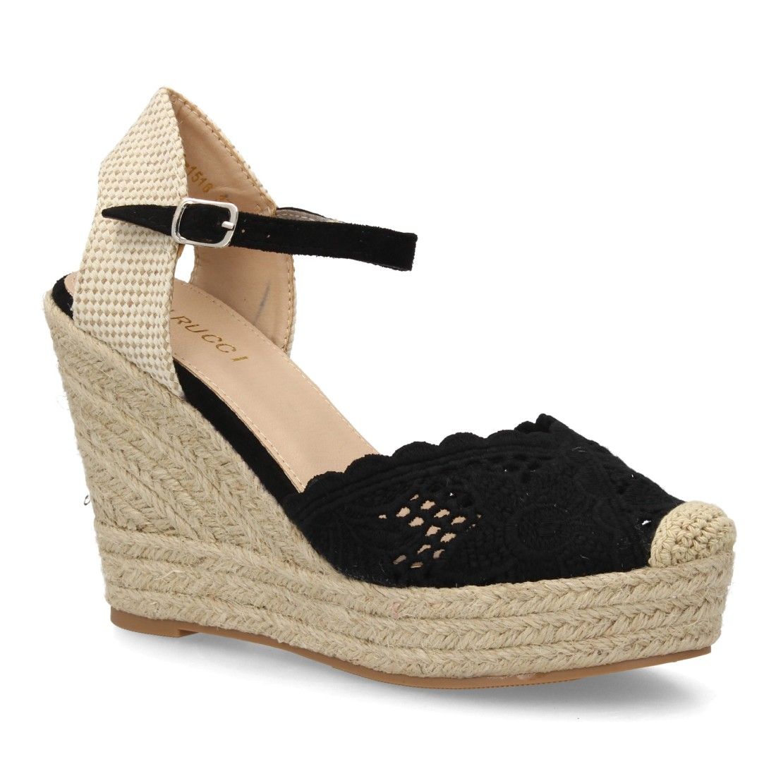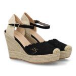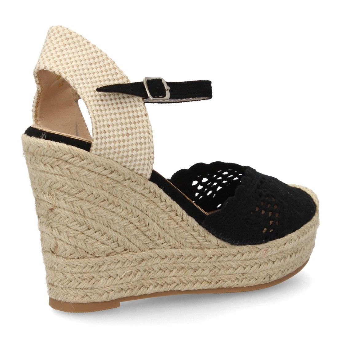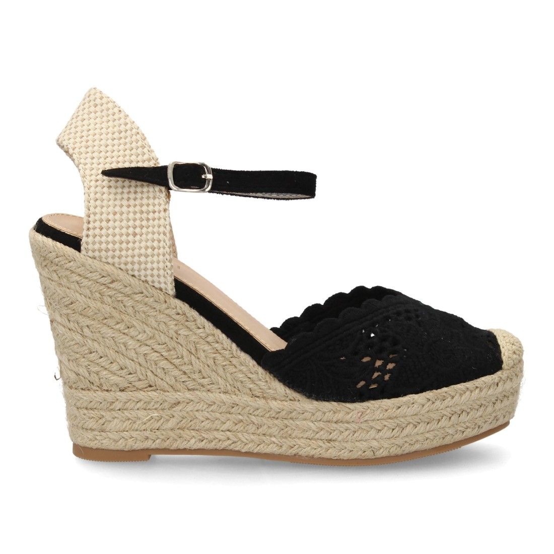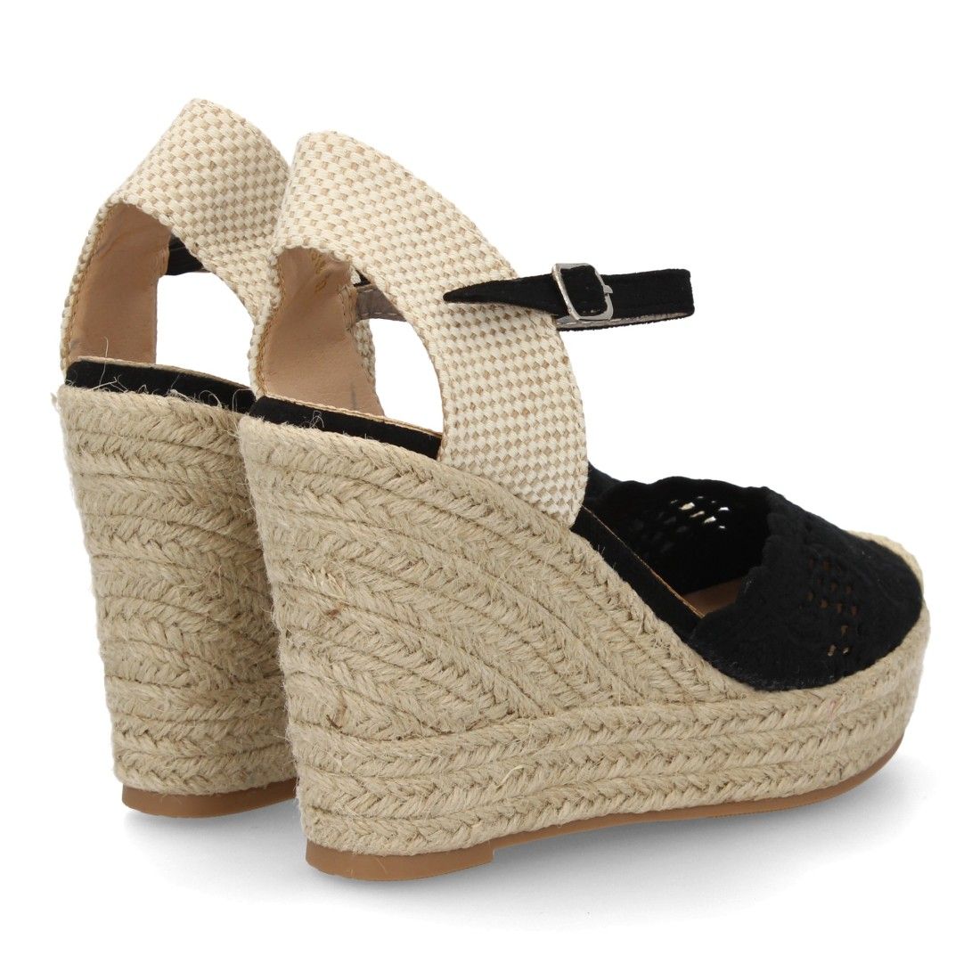 Alpargata de mujer con cuña de esparto y diseño bordado decorativo en la punta, estilo tradicional con cierre de hebilla destalonado. Ideal para mujer temporada de primavera verano