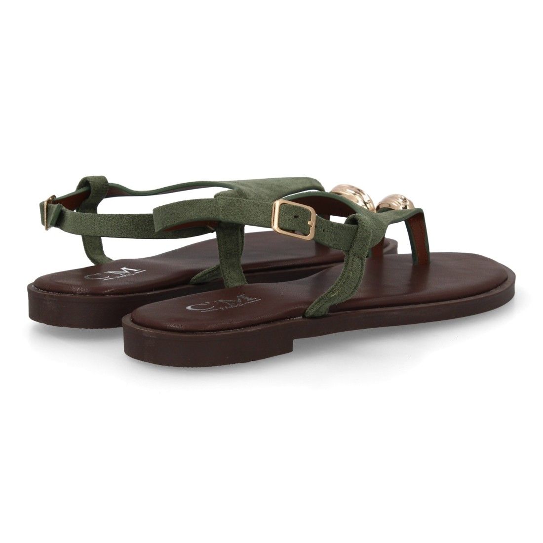 Sandalia plana de mujer con diseño elegante y minimalista, tira ancha que tapa el empeine. Adorno metálico. Muy cómodo. Cierre al tobillo con hebilla. Ideal Verano.