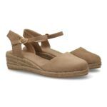 Sandalia Alpargata de mujer con cuña de esparto y puntera cerrada, talón abierto con cierre de hebilla. Cuña baja con plataforma ligera ideal para uso diario en primavera verano