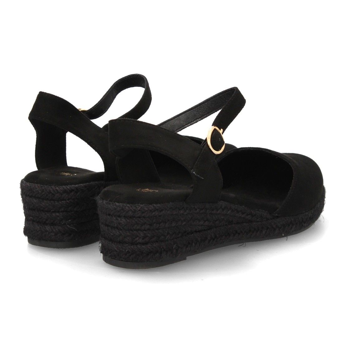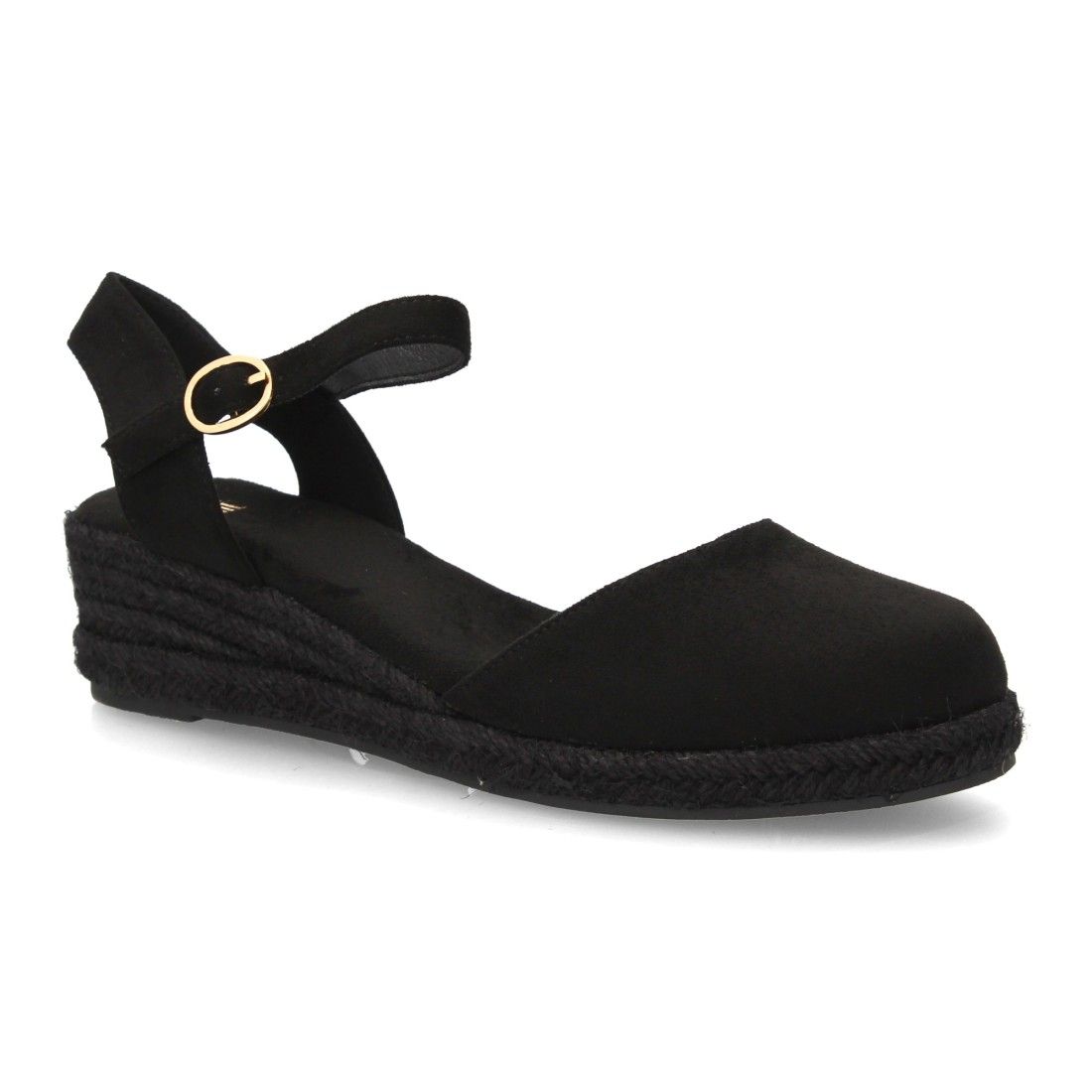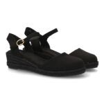 Sandalia Alpargata de mujer con cuña de esparto y puntera cerrada, talón abierto con cierre de hebilla. Cuña baja con plataforma ligera ideal para uso diario en primavera verano