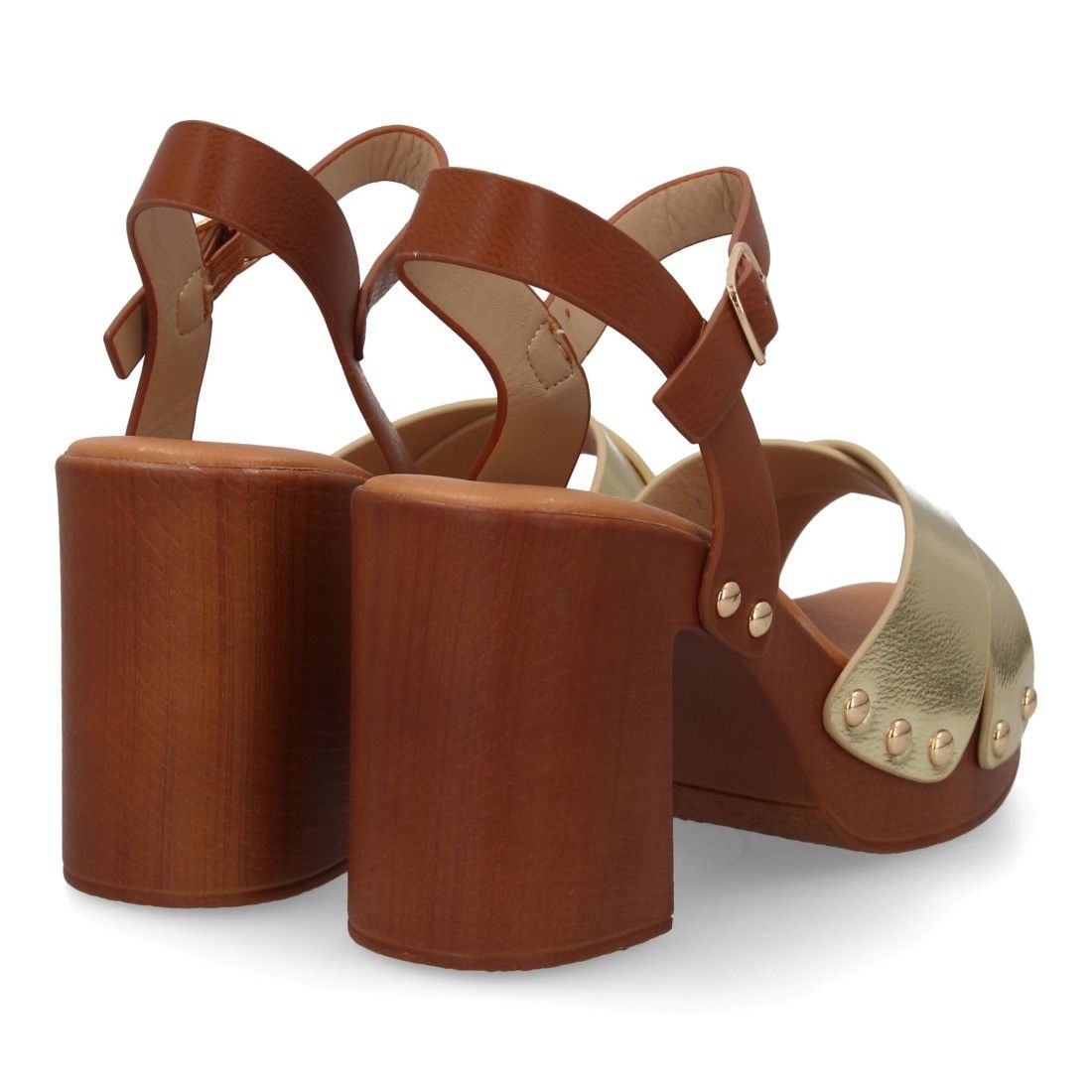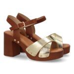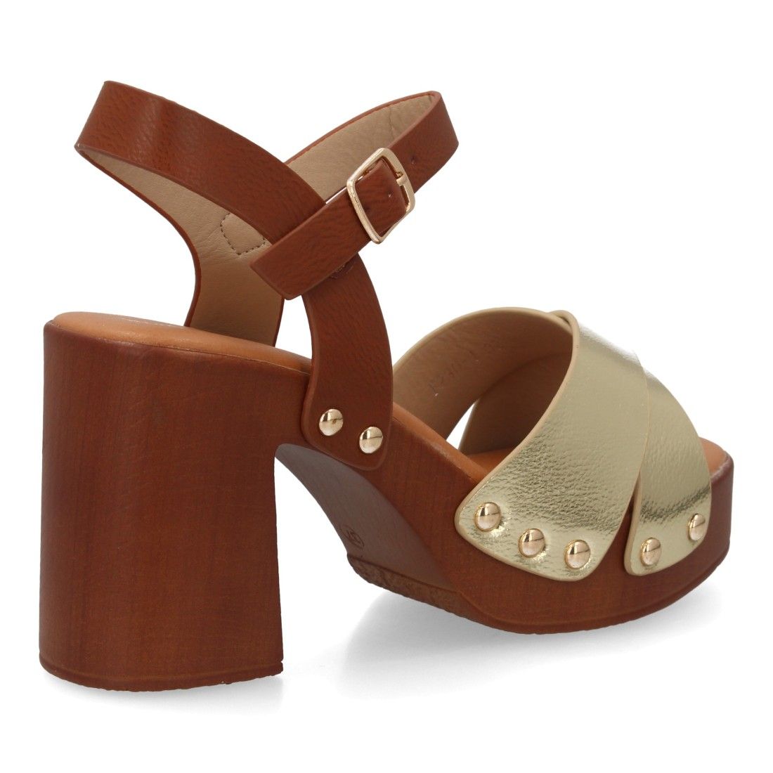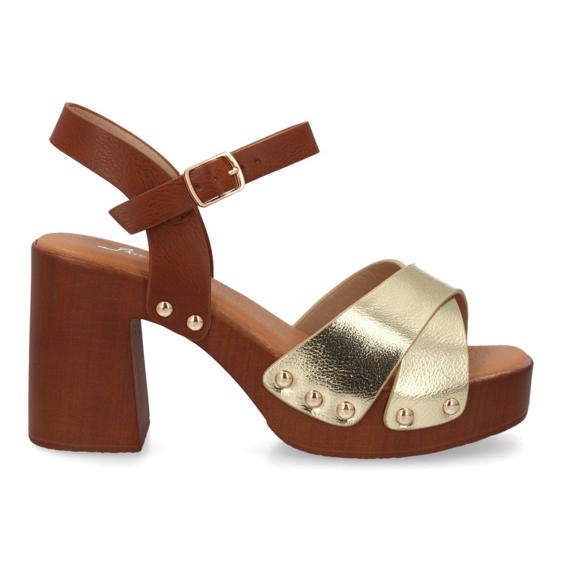 Sandalia de mujer con plataforma y tacón ancho estilo madera. Con diseño de tiras cruzadas y tachuelas metálicas. Cierre de hebilla, modelo cómodo y ligero para primavera verano.