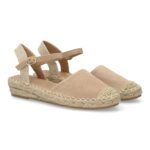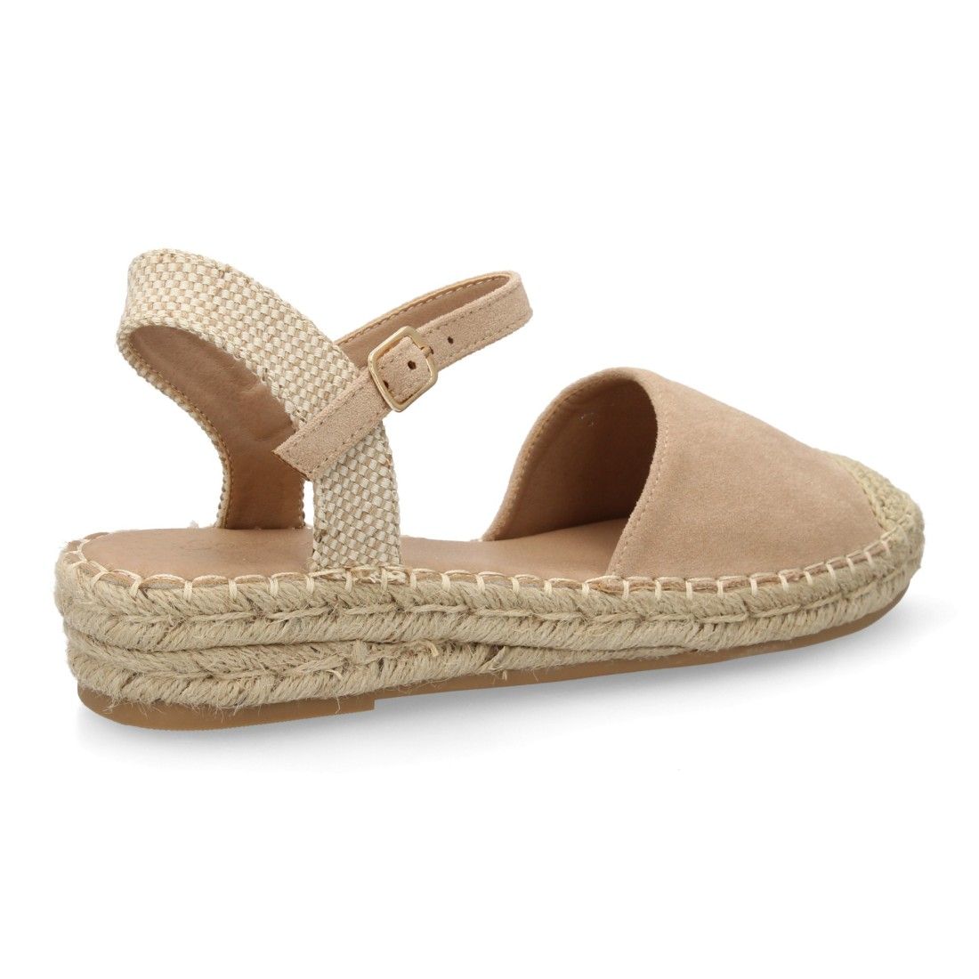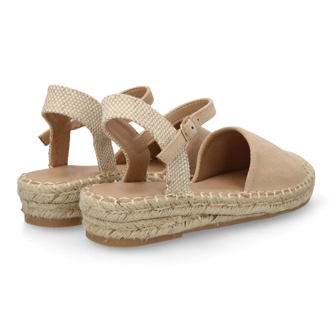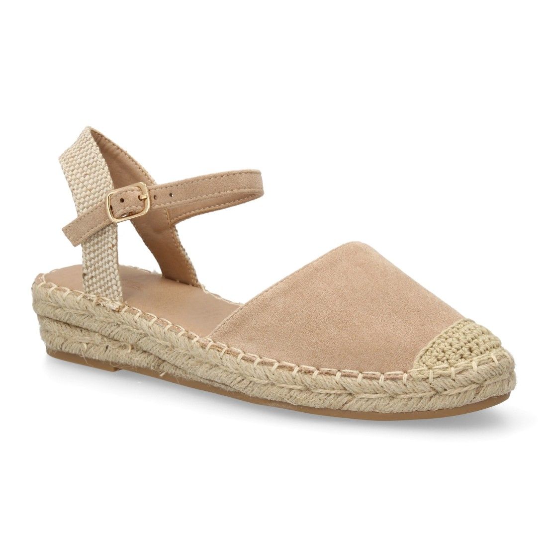 Sandalia Alpargata de mujer con diseño abierto, cuña ligera de yute, esparto. Estampado liso. Cierre de hebilla y punta cerrada. Ideal temporada primavera verano.