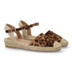 Sandalia Alpargata de mujer con diseño abierto, cuña ligera de yute, esparto. Estampado liso. Cierre de hebilla y punta cerrada. Ideal temporada primavera verano.