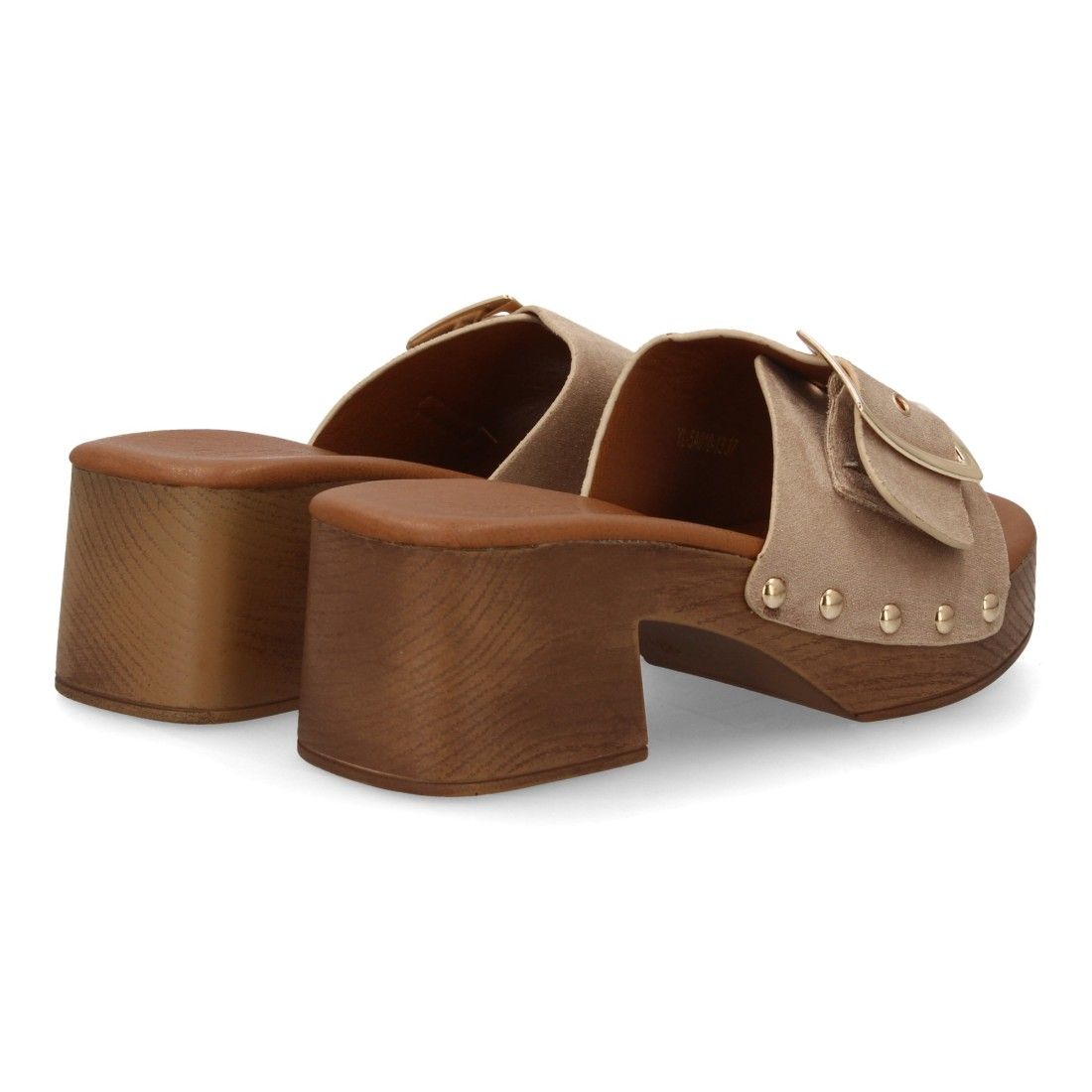 Sandalia de mujer tipo zueco con tacón estilo madera. Diseño con tira ancha, adornos metálicos y tachuelas. Calzado cómodo y ligero. Ideal para primavera verano.