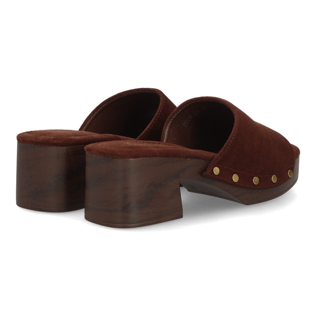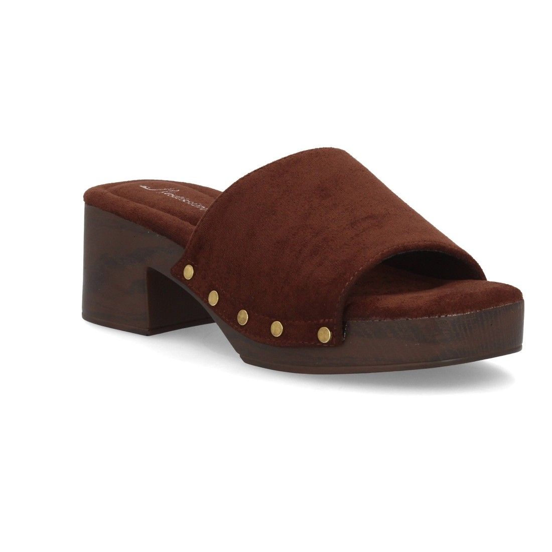 Sandalia tipo zueco de mujer con tacón ancho. Suela cómoda y ligera estilo madera. Pala ancha estampado liso, decorado con tachuelas. Ideal primavera verano.