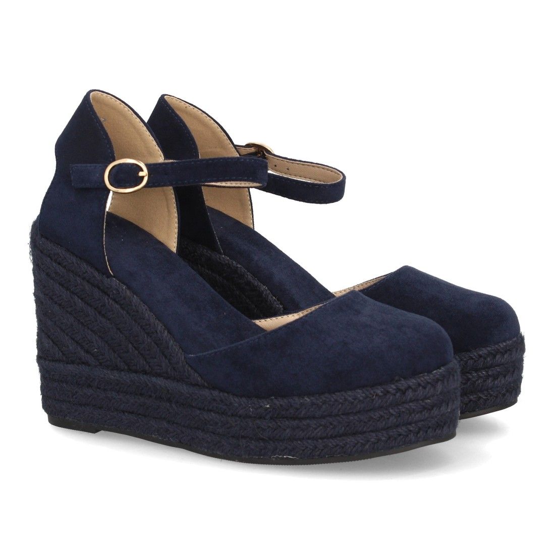 Alpargata de mujer con cuña y plataforma, punta y talon cerrados, cierre de hebilla en el tobillo, monocolor, cuña de yute trenzado ligera y cómoda para la Temporada verano.