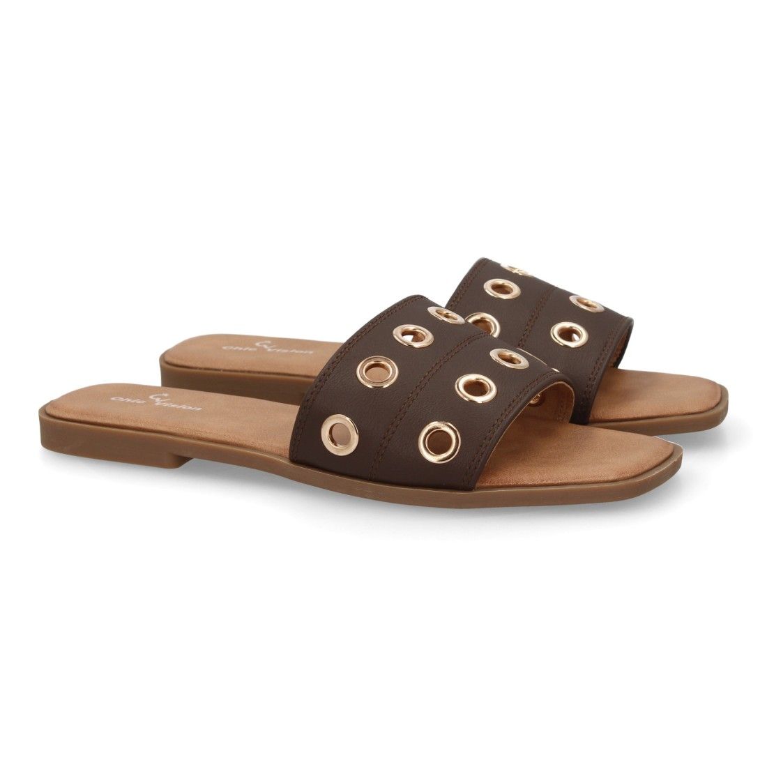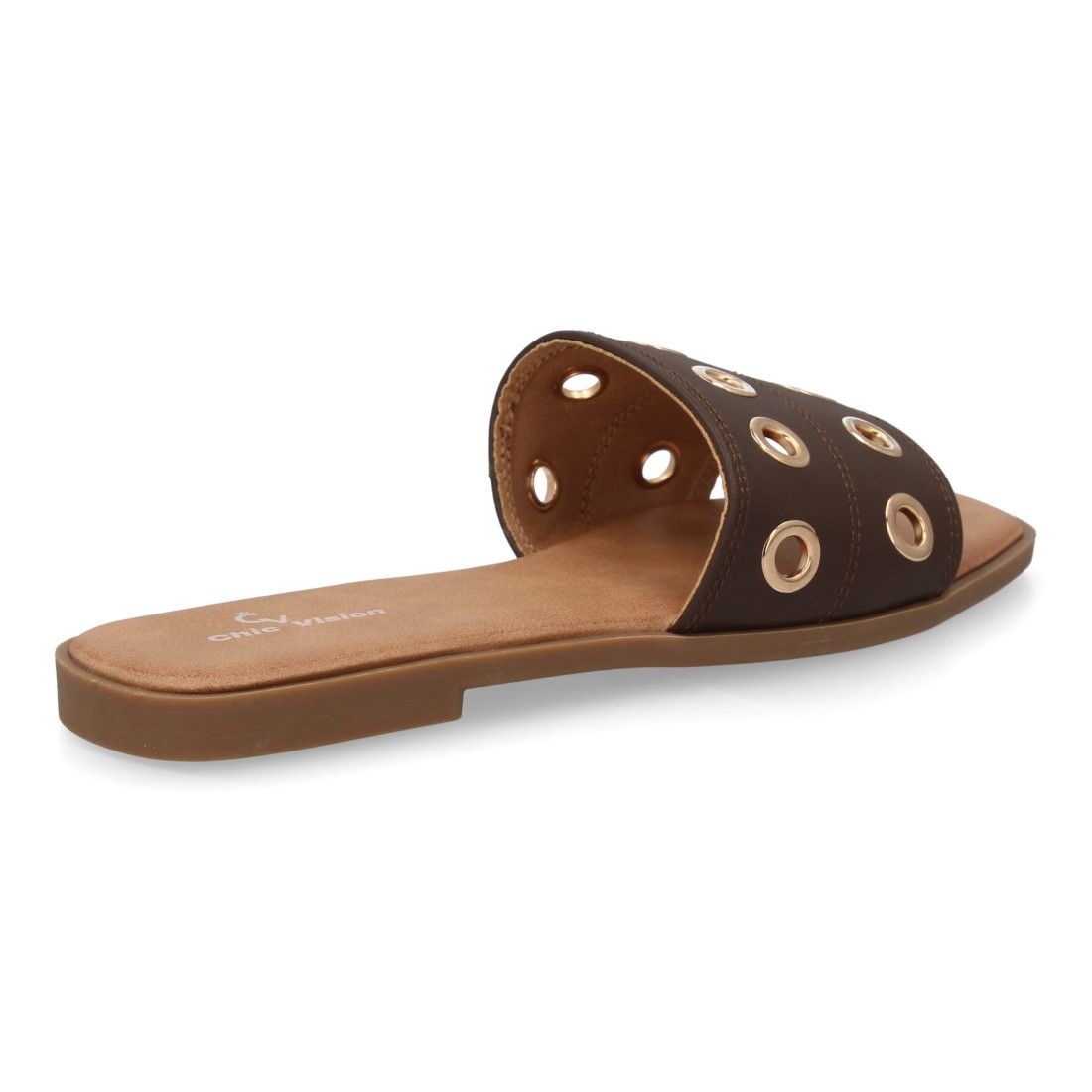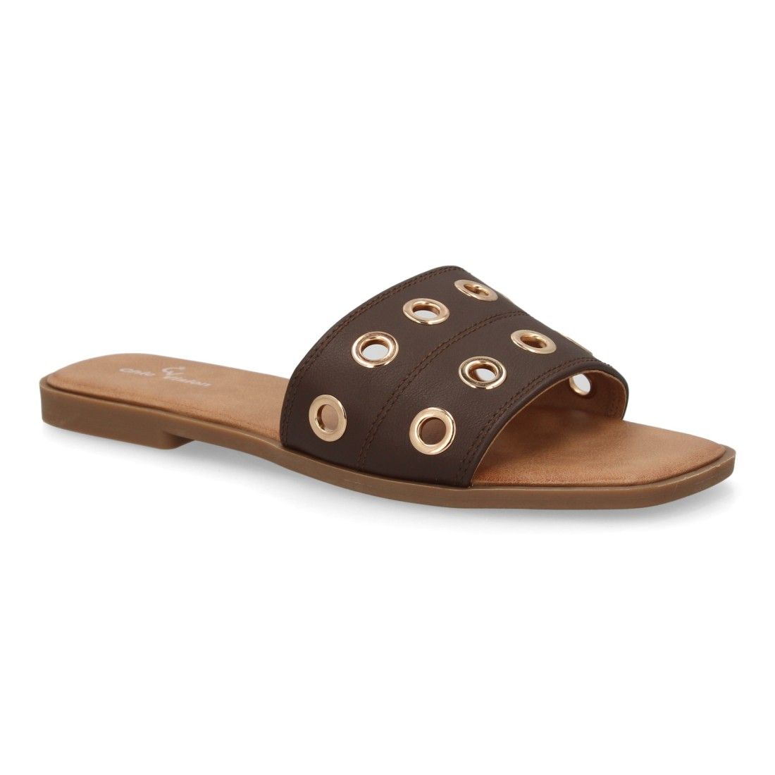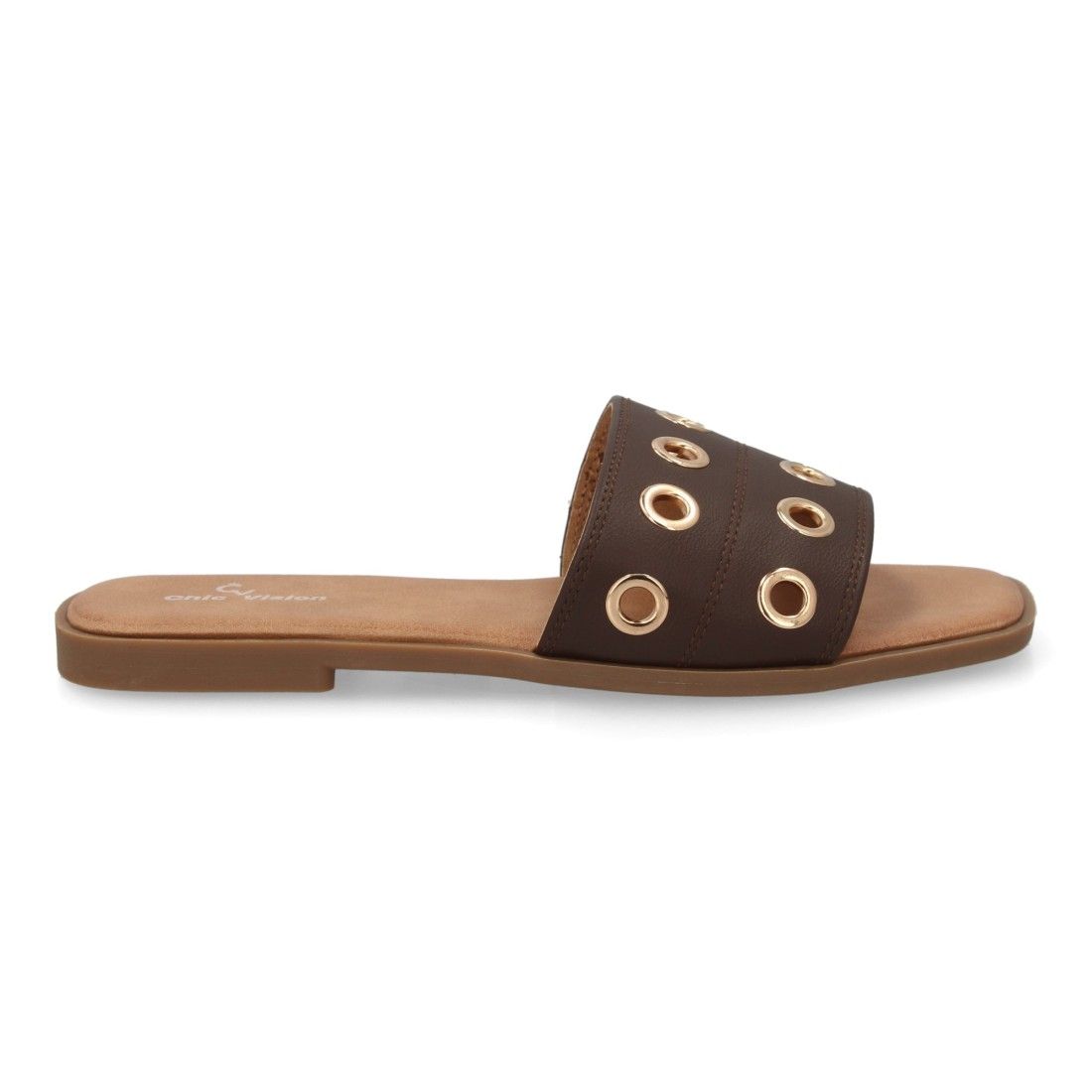 Sandalia tipo pala de mujer con diseño moderno, banda ancha en el empeine con ojales, agujeros metálicos. Suela plana ligera y acolchada, ideal para uso diario.