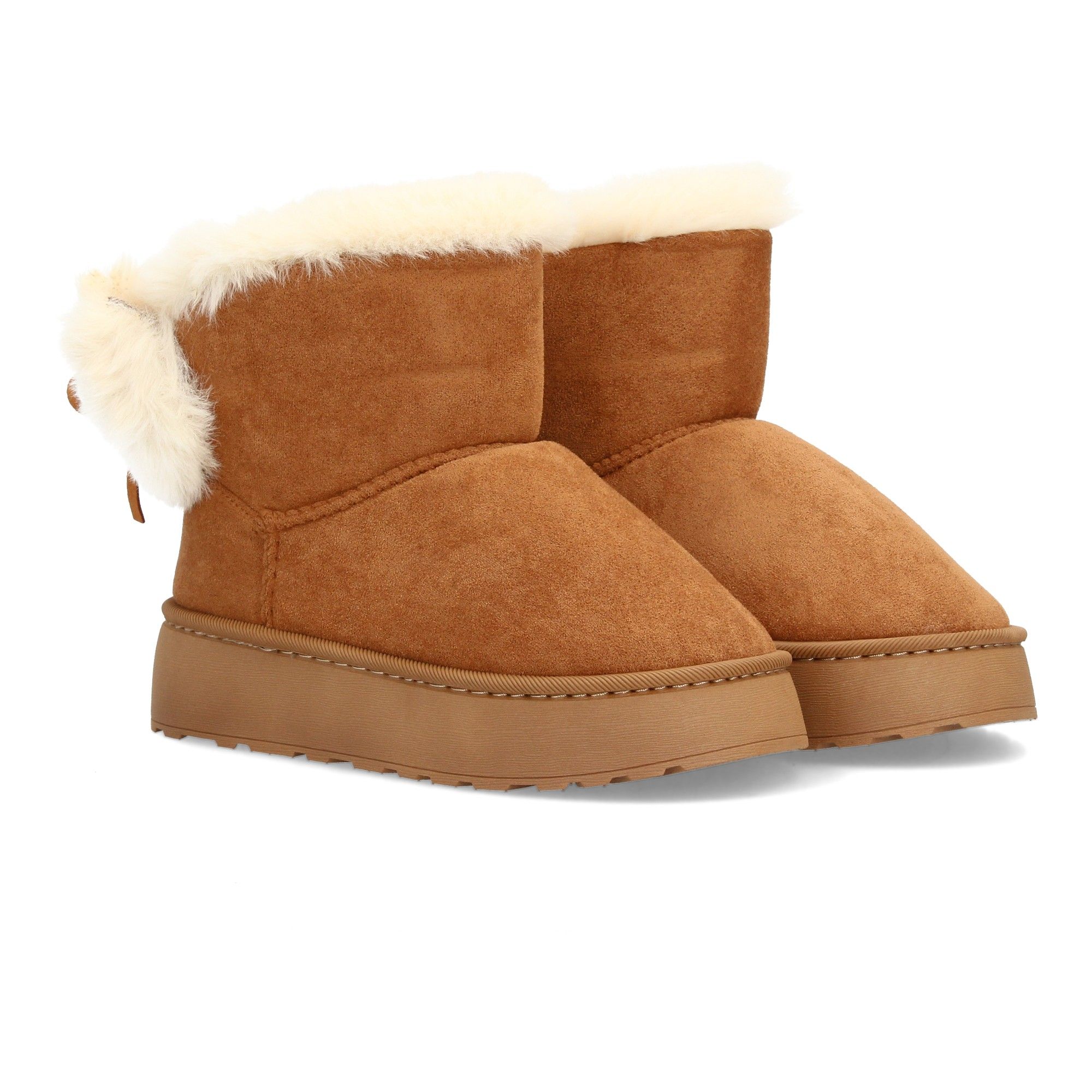 Bota para invierno con exterior de acabado afelpado y detalle de borreguito que aporta un look cálido y acogedor. Suela de plataforma antideslizante. Ideal para mujer.