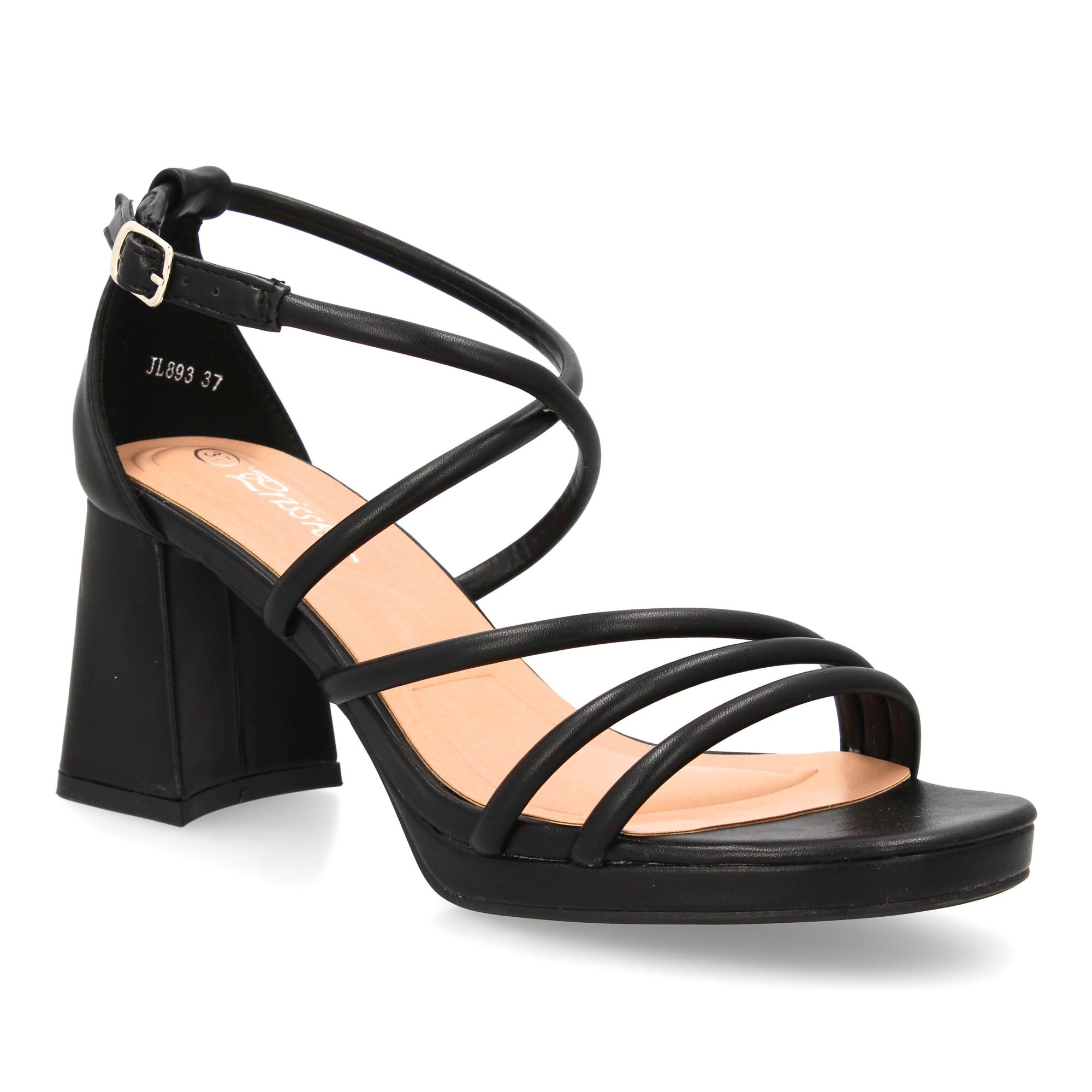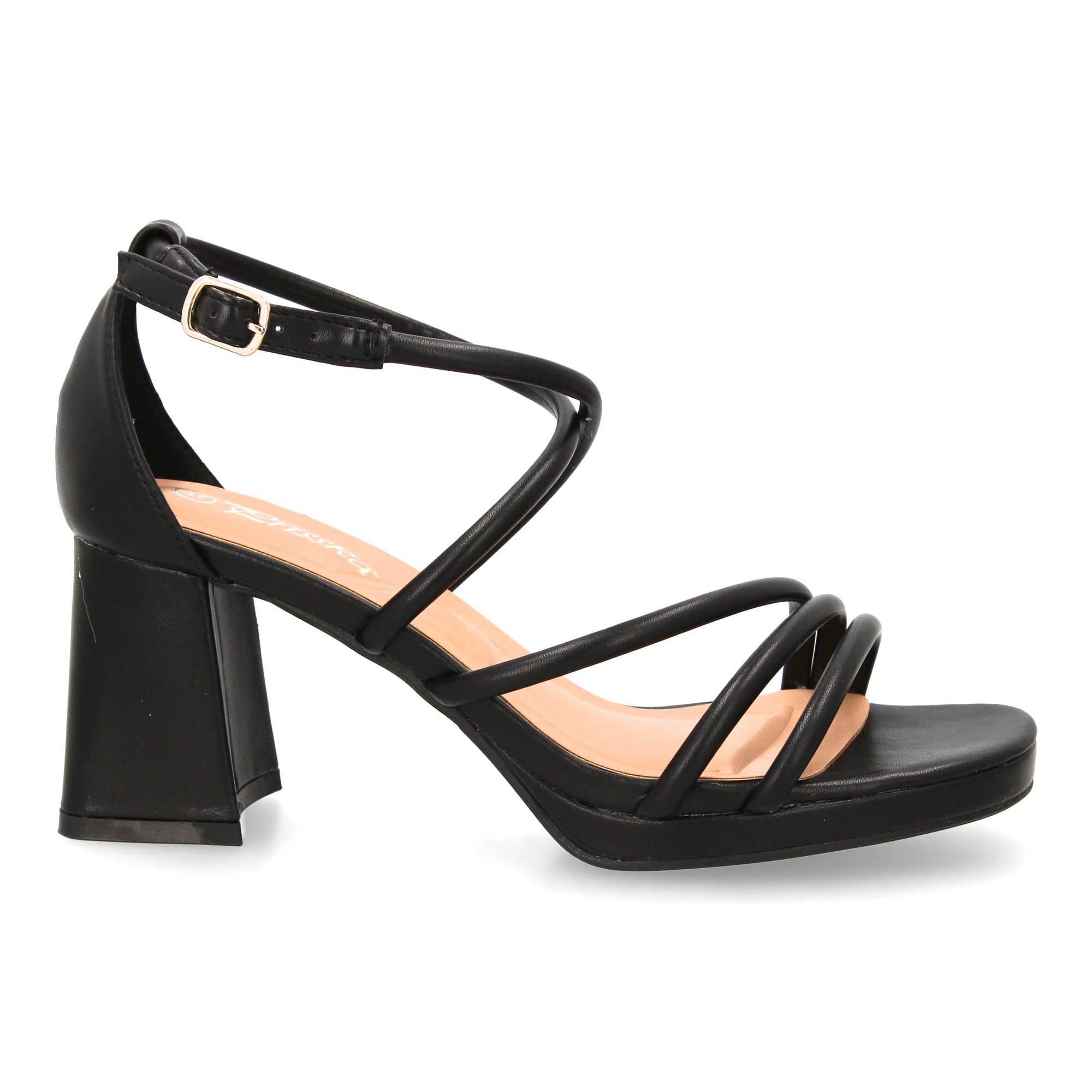 Sandalia de tacón con diseño de tiras finas y talón cerrado. Su plataforma y tacón ancho proporcionan comodidad ideal para ocasiones especiales. Cierre de hebilla.