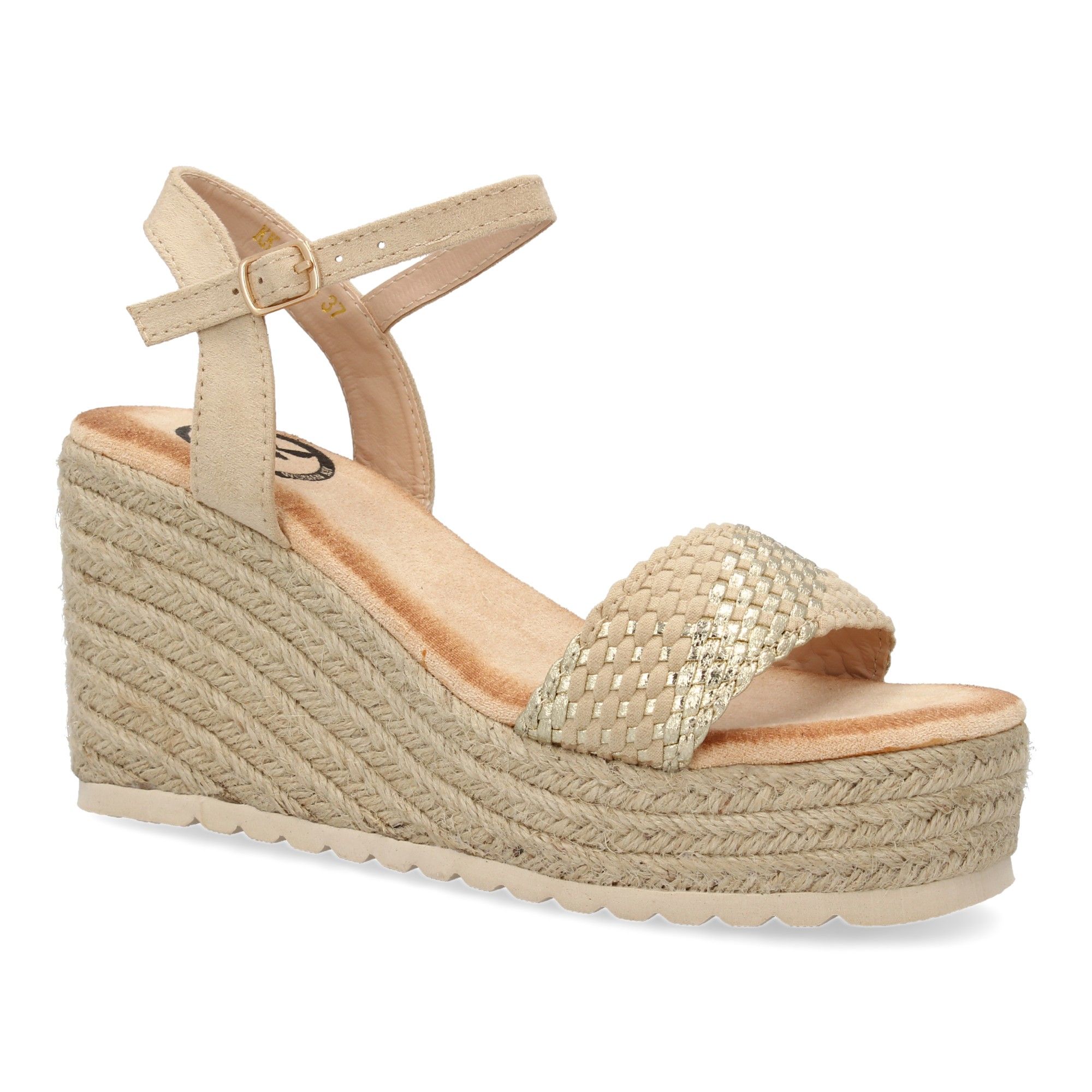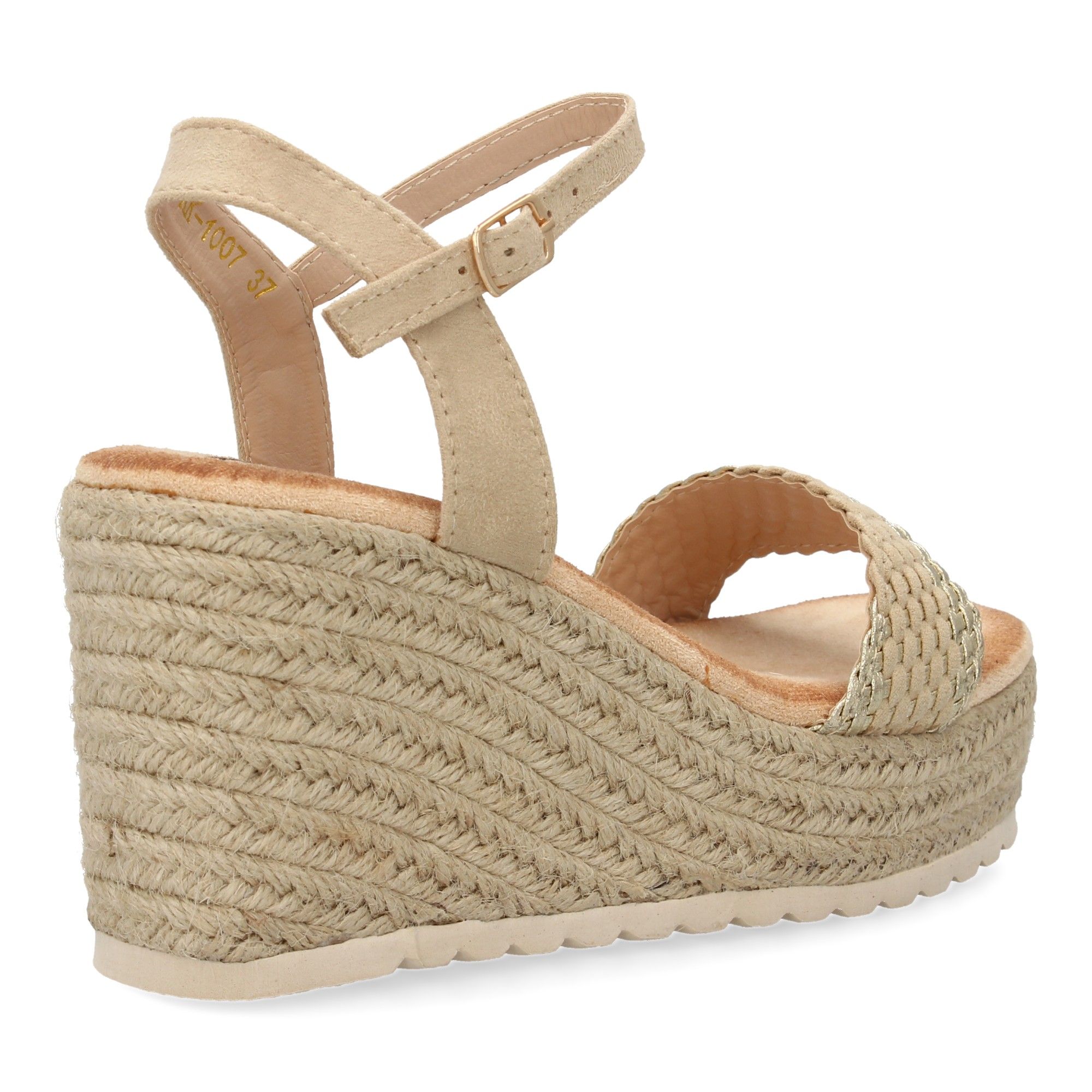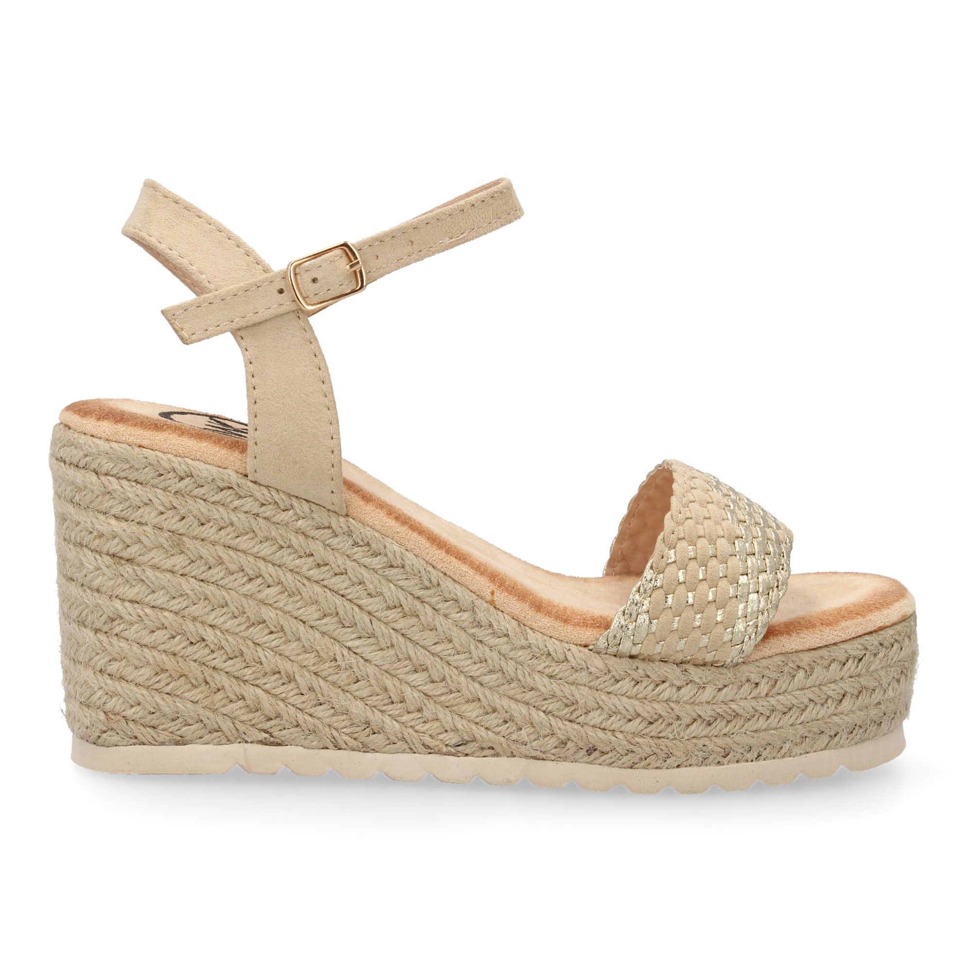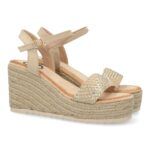 Sandalias de cuña de yute para mujer comodas y elegantes diseño moderno que combina dos colores en la pala con cierre de hebilla.