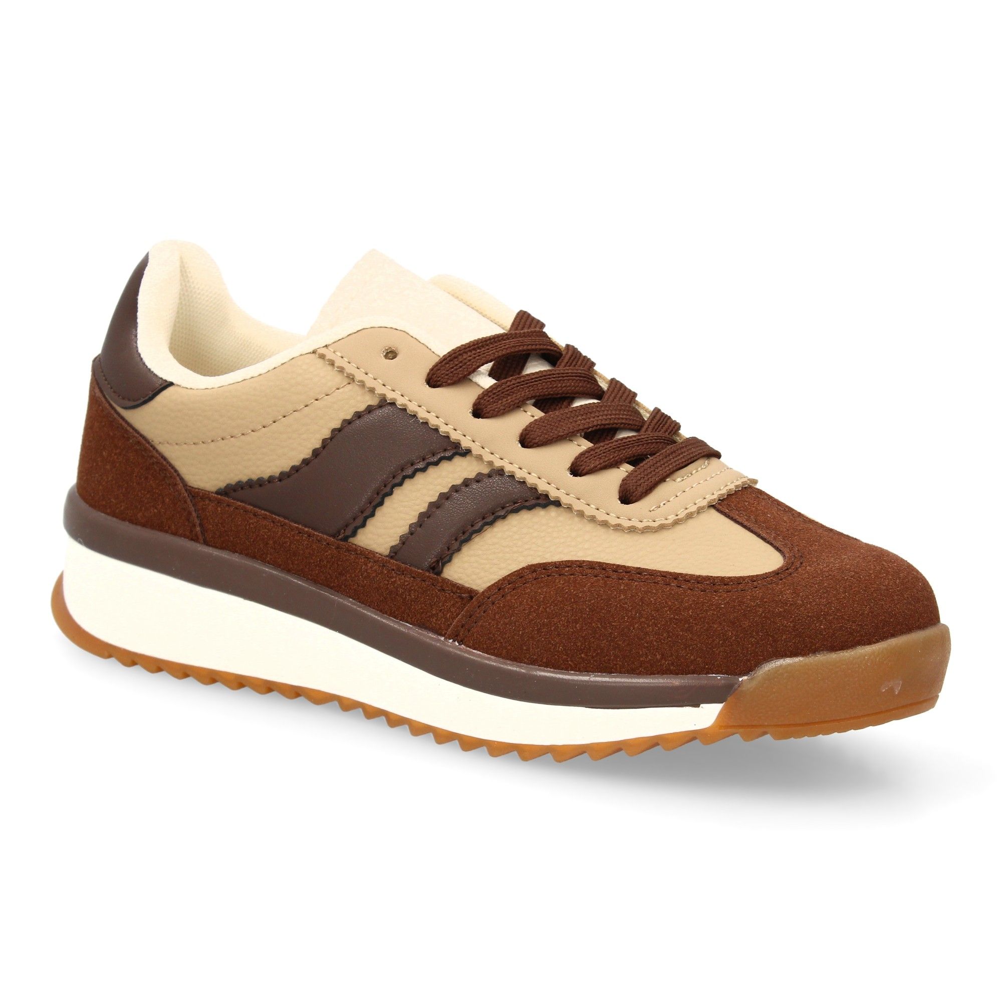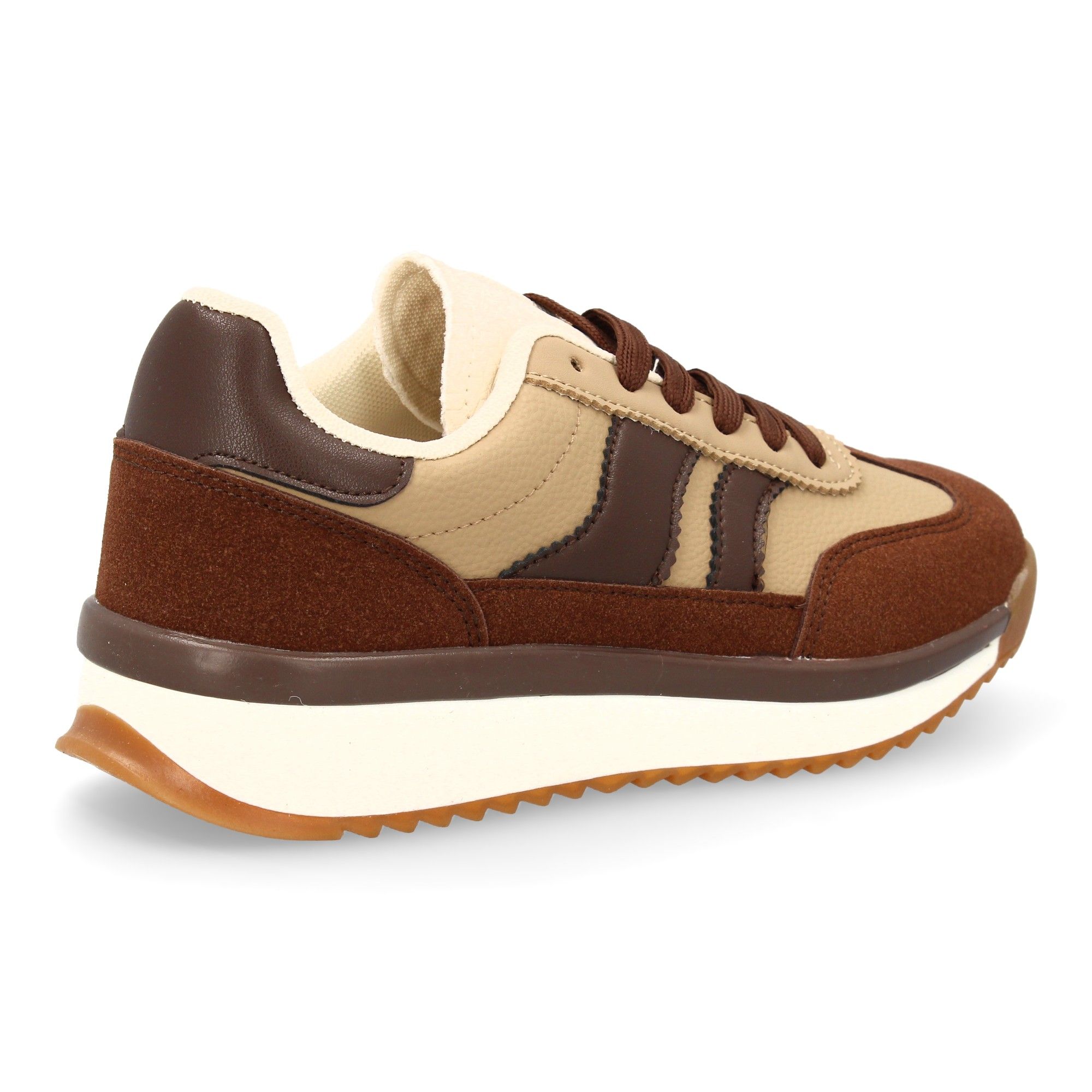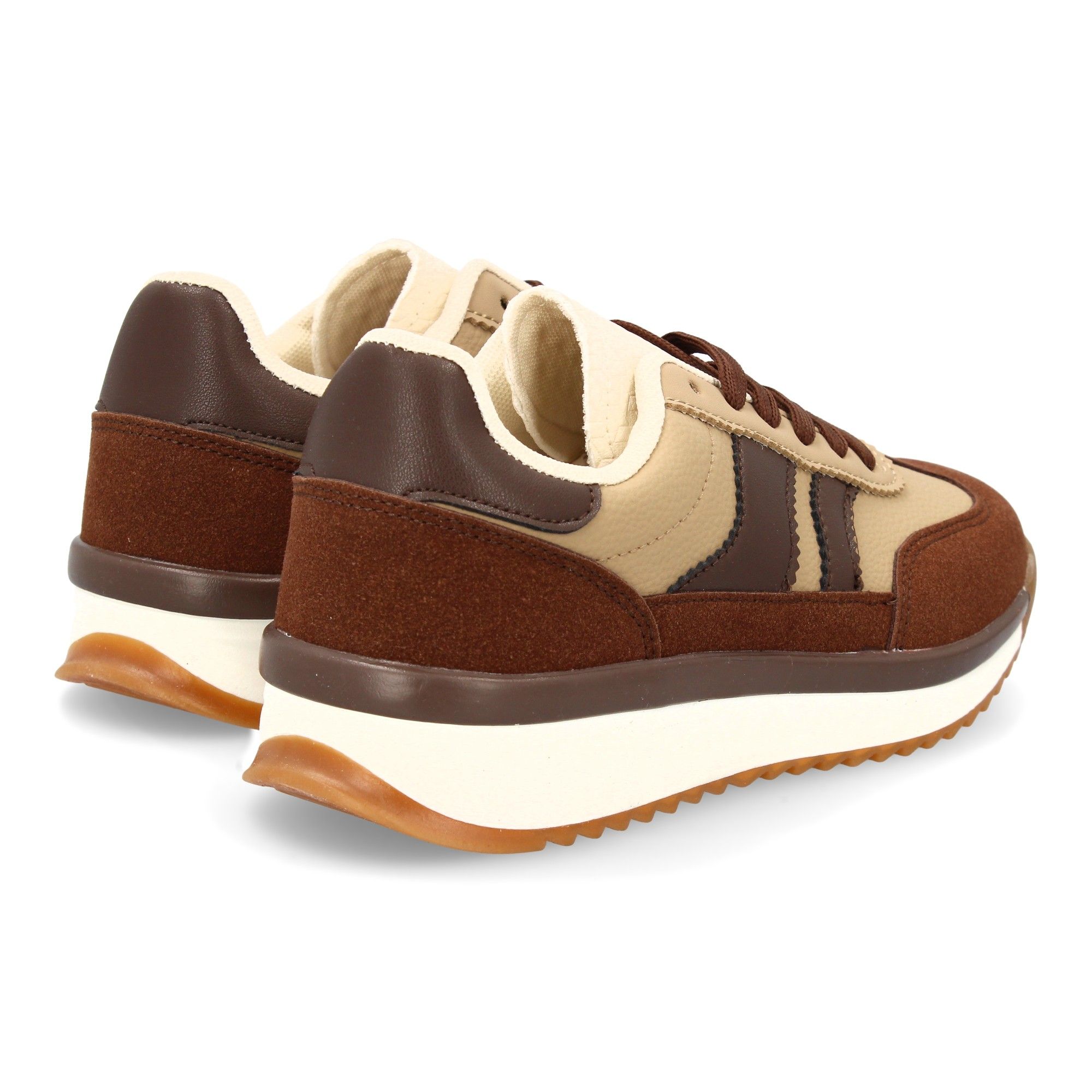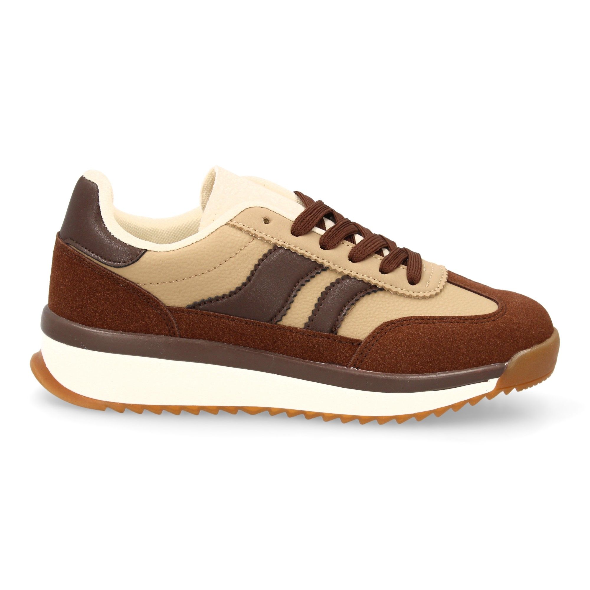 Zapatilla plana para mujer con cierre de cordones. Diseño moderno con contraste lateral. Estilo retro ideal para la temporada de otoño invierno.
