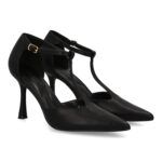 Stiletto de tacón fino diseño elegante silueta clásica. Zapato de salón con tacón alto y punta afilada con cierre de Correa al tobillo con hebilla ajustable y diseño en T. Ideal Otoño Invierno.